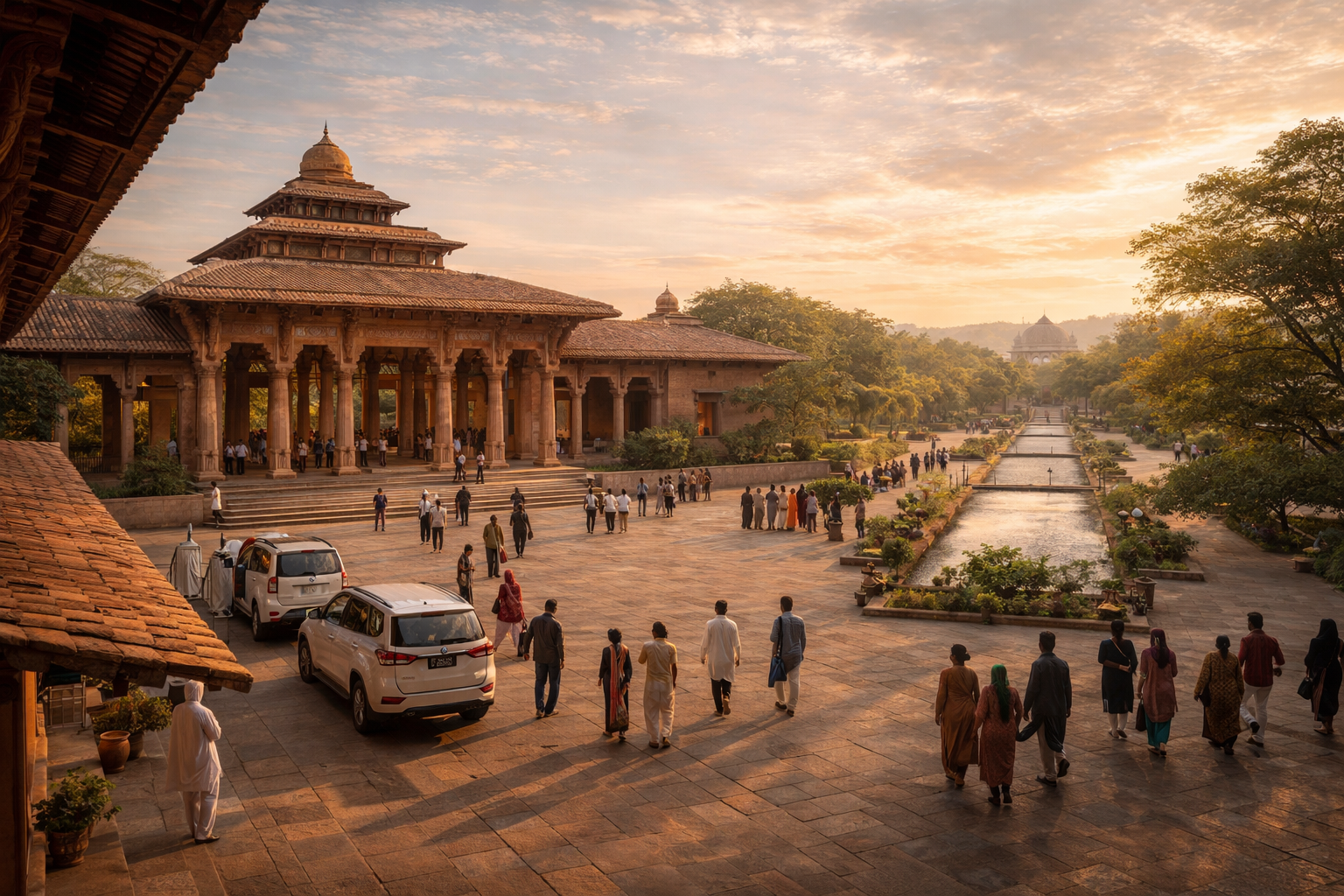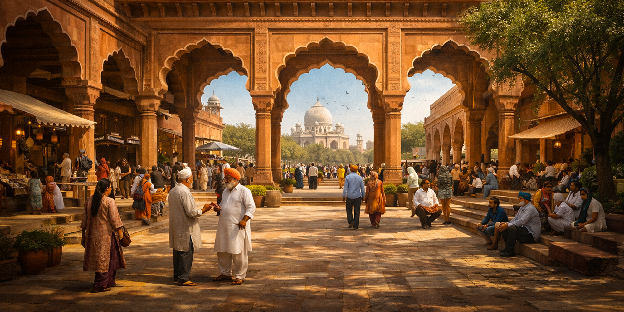 The Visitor Centre is inspired by Punjab’s historic sarais (travellers’ rest-houses) and mandis (market courtyards) — large, colonnaded spaces that once welcomed everyone. Its forecourt is generous and shaded, its archways drawn from the Mughal and Sikh architectural heritage of Lahore and Amritsar.