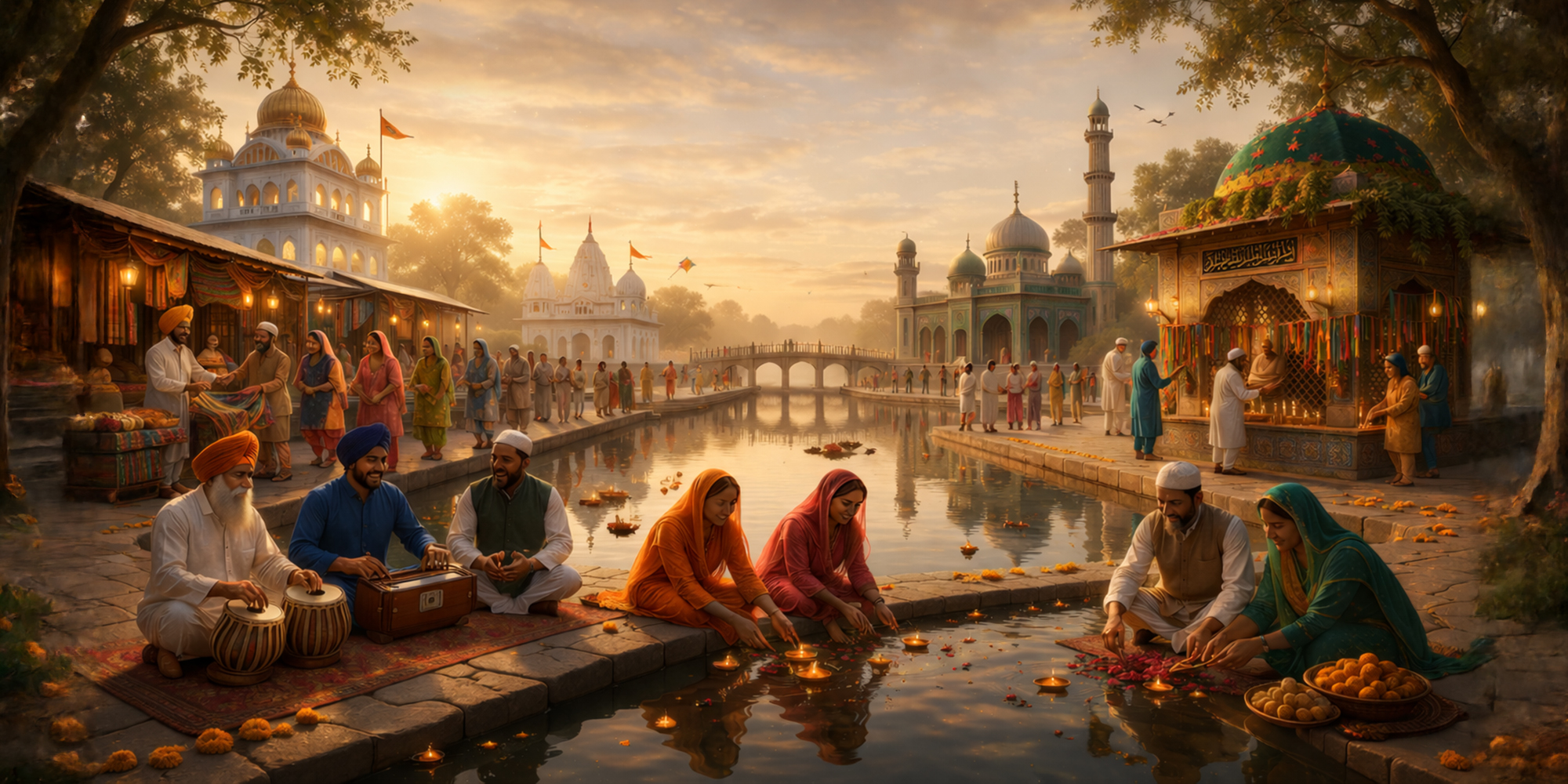 Sanjha is a Punjabi word meaning “shared” or “held in common.” It is the philosophical core of this project. The undivided Punjab was a land where Hindu, Sikh, and Muslim communities shared shrines, songs, festivals, trades, and neighbourhoods. Borders did not exist between devotional traditions; they were invented by political circumstance.